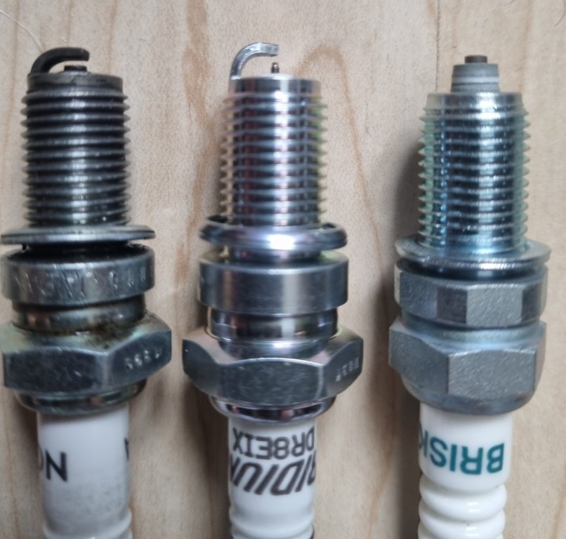 Da ich im Moment (noch) nicht fahren kann, hab ich mich mal mit den Zündkerzen beschäftigt :?: :idea: :roll: und normale NGK DR8EA , einen modifizierte (gekürzte Massenelektrode, nennt sich side gapping... ein 60ziger jahre mod. der NASCAR) DR8ES und eine DR8EIX mit gleichem Elektrodenabstand 0,7mm ...