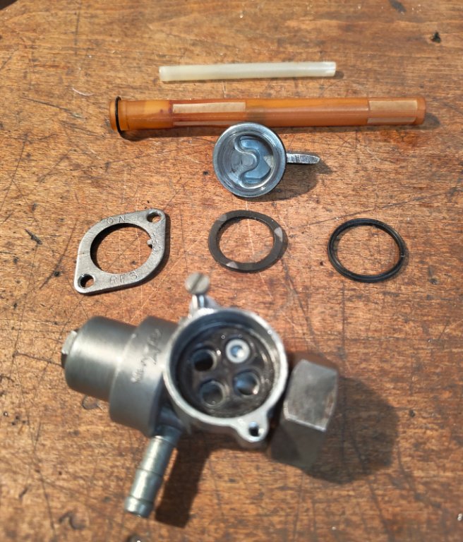 Der Honda-Benzinhahn hat zwei sehr gute Filter, die sauber geblasen werden können. Da erschließt es sich mir nicht warum gelegentlich noch ein dritter Filter auf dem Weg zum Vergaser montiert wird.