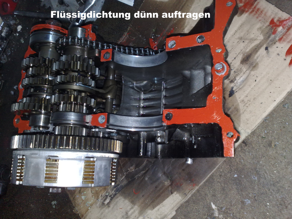 Alle Motorhälftenbolzen von groß nach klein und schon über kreuz anziehen.