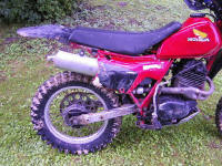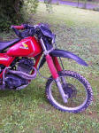 rahmen. xr600 gabel/rad/bremse. renthal lenker in schicken blau. 38dellorto mit schnellgasgriff. erweiterter luftfilterkasten. yz sitzbank. dt heck. selfmade husky endtopf. die passenden reifen. um dem ganzen ausdruck zu verleihen noch eine ronco lampenmaske mit h4. diese maschine bin ich letztes jahr in schweden im wald/ auf der motcross strecke, zuhaus auf den koppeln und wiesen gefahren. überall wo ich lang kam. so habe ich dann diesen frühling einige umbauten vorgenommen wie gabel, vergaser, endtopf. s.o. nach den umbauten habe ich meine probleme, bis auf das hintere federbein, allesamt beseitigt bekommen. wert habe ich auf fahrbarkeit und power gelegt. ist auch gelungen wie ich finde. geht gut los. |