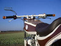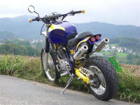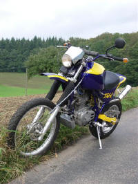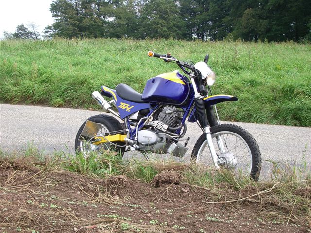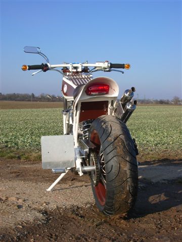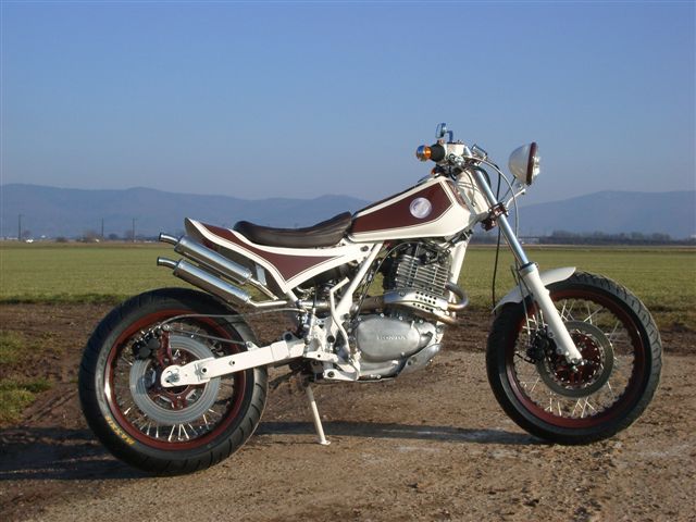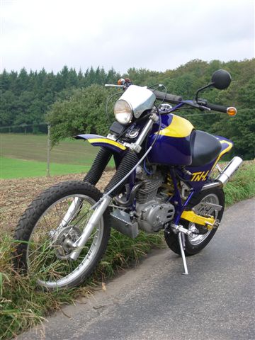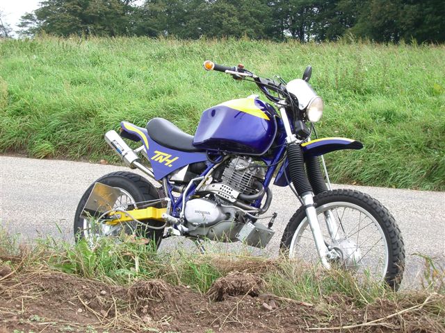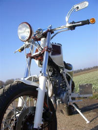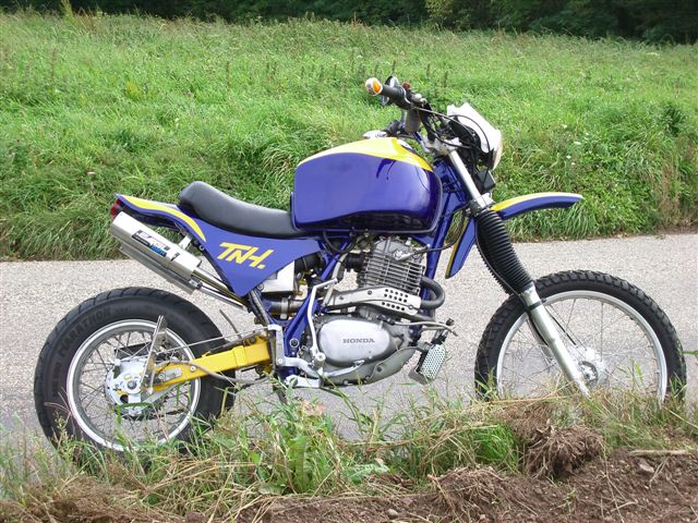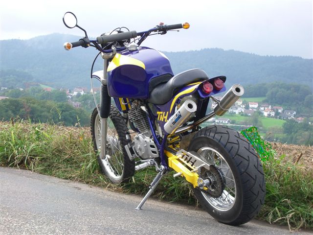 TNH Funbike XL 500 R Einzelstück, Sonderanfertigung 2008 · Rahmen PD02 gekürzt, Rahmenheck abgesenkt, vollständig modifiziert · Motor XL 500 R, bearbeitete Kanäle · PHF 36 Vergaser Dellorto, offene Filtereinheit · Elektrik modifiziert und auf das aller Wesentlichste beschränkt, Gel Batterie · 37er Gabel CB 900 F Bol d´Or, Luftunterstützt · Gabelstalbilisator, HK Motorsport Fender · Gabelbrücken CB 900 Bol d´Or, Superbikeadapter LSL, pulverbeschichtet · LSL Streetbar Lenker, Ochsenaugen · HK Motorsport Lenkrohr · HK Motorsport Doppelrohrauspuff, VA · HK Motorsport Monocock aus Blech · HK Motorsport Kettenschutz Alu – TNH-Design · HK Motorsport Nummernschildträger seitlich · HK Motorsport Tank mit Gepäckträger · HK Motorsport Sitzbank, Leder · HK Motorsport Schwinge, pulverbeschichtet · Sanremo 5,5 x 17" / 180/55 Maxxis hinten · Talon Nabe hinten, ohne Ruckdämpfung · Sanremo 3,5 x 18“ / 120/70 Metzeler vorne · Felgen, Naben, Speichen, Nippel pulverbeschichtet · Anbauteile pulverbeschichtet · CB 900 Radnabe mit Bremsscheiben · Doppelkolben-Bremsanlage CB 900 Bol d´Or · Allegri Cesare Stahlflexleitungen · HK Motorsport Bremsscheibenadapter hinten · HK Motorsport Kettenradversatz und Adaper · Classic Scheinwerfer auf HK Motorsport Träger · Lackierung TNH Design by HK Motorsport |