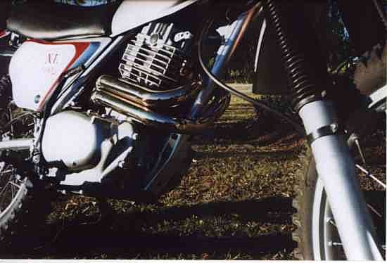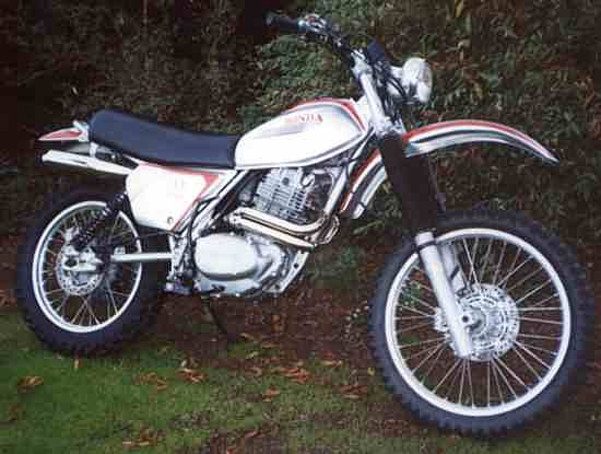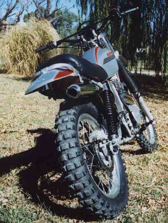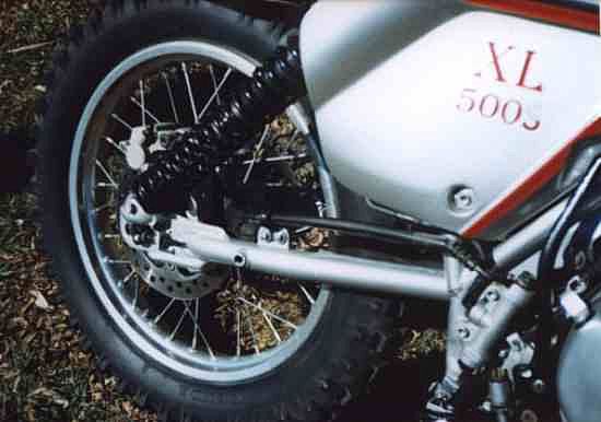 I brought my 1980 Honda XL 500S about June 2000 $250. It was running pretty good when I saw it, but it wasn't really for sale until I asked the owner. He said "well anything is for sale", so I asked him how much?. He said $300 and I said $250 but he was not sure. I took it for a ride and it went ok but it was jumping in and out of first gear all the time above idle but the bike didn't blow any smoke. I told him not to go selling it for the next few days while I thought about it. The next day came and I wanted to buy it for sure so I called his wife and she said somebody else was buying it. So I offered the money right there and then because I had it in my wallet. Well, these people are not real reliable so the next day came before I heard a reply, Living next door, She came over to our house on the way back from somewhere and talked. She rang her husband and it was not sold yet so she said $250 to him and he agreed and I brought it. I went and rode it back right then, it was shaking around a bit when I got to about 60 Km/h. It turned out that the back rim was buckled bad. I checked the oil before I went for another ride and I saw "@!$^&** NO OIL AT ALL IN THE GEARBOX", so I topped it up with what we had around and started it up. Again, it blew heaps of thick blue oily smoke! The old owners wife was still there and she said do you still want it? I said yeah for $250 you can't go wrong, so I kept it. Really it was way to smoky to ride, it was about three times as smoky than an over oiled 2 Stroke, so I only rode it occasionally for the next 2 weeks until I decided to go for a complete tear down and fully rebuild the beast. When I rebuilt the engine I spent over $650 on parts, and I bead blasted the entire engine with a homemade bead blaster that we whipped up in not long in a 44 gallon drum. To do this everything needed to be totally dismantled. It took a while to rebuild the engine because I kept finding other worn parts and then getting money and the time it takes to get the parts. When I pulled it apart there were gouges scratched on the torque side of the cylinder, obviously from running dry for a short time, I needed to re-bore from standard to .75mm over size (3 sizes). Every thing else in the top end was fine, except the inlet valves that were really pulled into the head, so I put new after market valves in it. The cam was also in good condition. Of course I replaced the timing and balancer chains with new ones. When I pulled the gearbox apart it all looked fine, but it took a really good look, the first gear selector fork was twisted and bent and the 4th gear what meshes into first was rounded on the ends where it actually goes into first. I replaced the fork and gear with second hand ones. I also put brand new oil pump gears and a sprocket oil seal in. While I was looking for a new back rim, I found a friend who had one so he gave it to me for free (well it think it was for free). When I saw it, it was a disc brake wheel and he had all the bits to make it work so he gave me them too. From there on I was looking for a later model disc brake front end, because you can't just have rear disc, can you? So I went onto repairing the side covers as one was cracked pretty bad, my father is a panel beater/spay painter and he had some glue to glue it up with, I had heaps and heaps of trouble with it cracking back through the primer after a few days, even now it is still cracked. All the other bits were fine and just needed some chips filled and a good coat of filler primer. I even painted the switches on the handle bars metallic black and all the red lettering again. They look better than brand new. The front guard that I had was off something else so I needed another one. I got a second hand 81-84 model XL 250 front guard. I was having a lot of trouble with the primer falling off, but anyway I just needed to be careful. I got the frame sand blasted and applied a coat of primer straight on and sat it aside for a while until I had finished with the other bits. I then shoved the engine into the frame to get my grandfather to make some spacers for the axle to line up the front and rear sprockets to suit the disc brake hub. He is a retired fitter and turner by trade and has all the machines in his garage. After that we started to fit up the brake caliper and master cylinder, I used the same old pedal and just cut off all the other bits what used to pull the cable. After I mounted the master cylinder I made a bracket and welded it to the pedal to push the piston. It is virtually set up like a new bike these days. We then needed to make and extra bracket off the original caliper bracket to make up for the extra space of where the stopper to stop the caliper from going around with the disc. Because of the twin shock, the caliper could not be put in its proper position. We made the bracket and welded some bits to the frame and there you go, a disc braked rear XL 500S. Well now, the front end also needed a disc brake to match the rear. I asked the man who I got the rear wheel off of if he had a front wheel, he didn't. So I looked again for a front end, without wanting to spend too much. A swap meet was coming up so my father, a friend and I went to the meet. We had almost lost hope in finding something because all that was there was early model stuff like pre 60's. Well we stumbled across a shiny thing and checked it out, unbelievably it was off a 84 XR 500 with everything on it except a front wheel, even the speedo, caliper and master cylinder was on it. We asked how much and they wanted, $200. That was pretty cheap but we ended up getting it for $150, a BARGAIN! So we carried it around for another 2 hours. When we got home the rim with the 18 on it fit perfectly into the forks disc and all. I eventually found a secondhand wheel at a motorcycle wreckers for $75, the spokes were really rusty but I had ideas and brought it. I accidentally broke one spoke and needed to buy one new one. I ended up clean