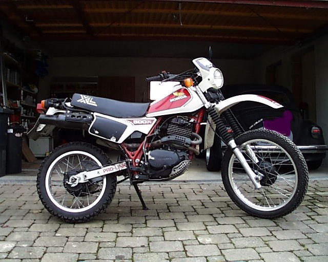 als Original) hält seit 11(!) Jahren. Selbstgebauter Sound- Auspuff (einfach Original- Topf aufsägen, ausräumen und sauber zuschweißen) gibt Super Sound. War mit dem Teil schon 3mal beim TÜV ohne Bemängelung!!! Z.Zt. wird umgebaut: Rechteckscheinwerfer v. XL600, 20l- ACERBIS- Tank. Evtl. Komplettzerlegung und Lackierung im nächsten Winter. |