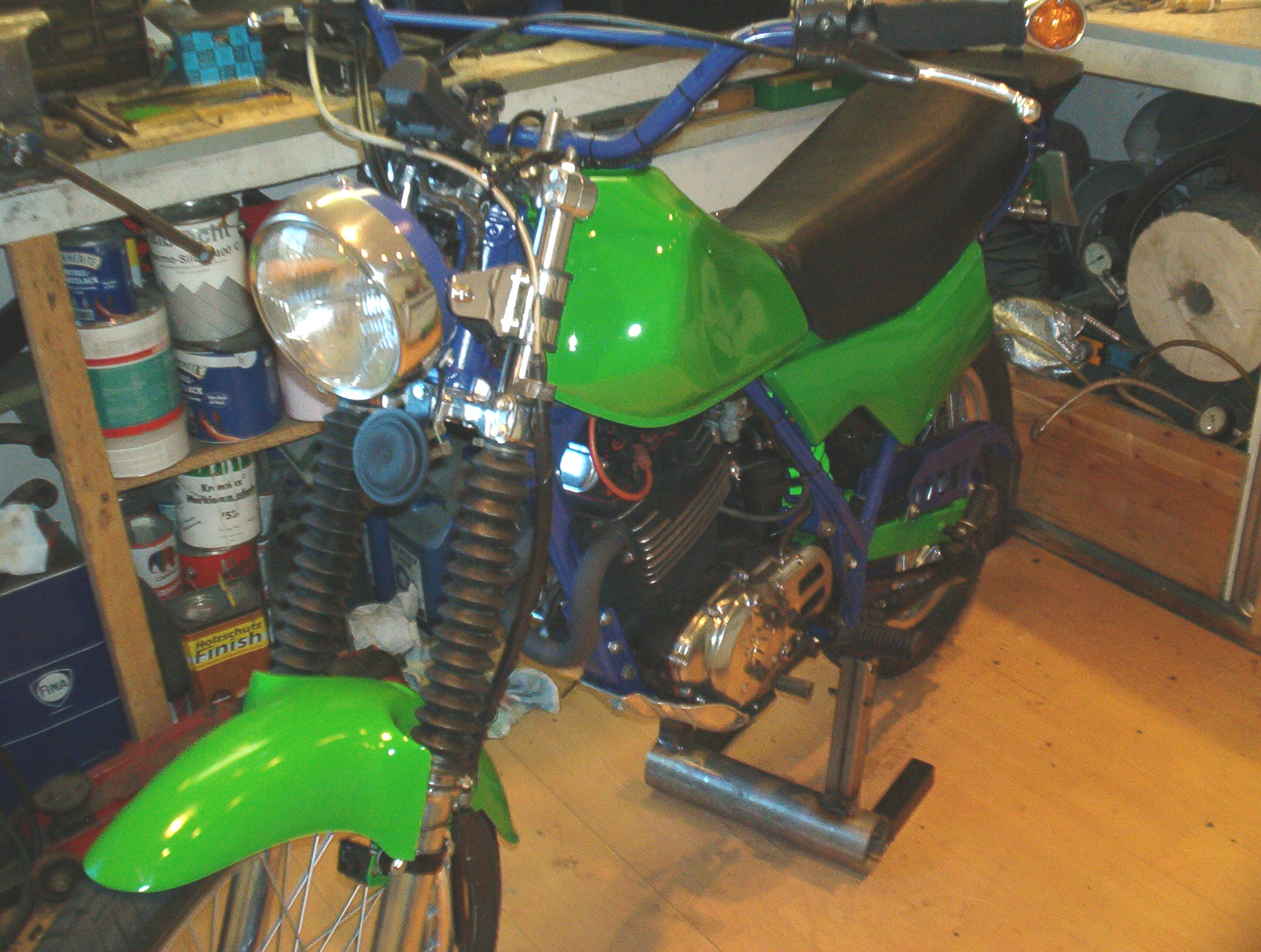 Besondere Umbauten: | komplette gabel von 500klr . reifen vorne 90/90/21 hinten 130/80/17 Metzler tacho sigma 700 ochsenaugen mit tomaselli übersetzung 15/38 Alluteile alle poliert. |