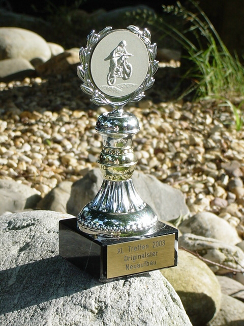 . . . . gefahren. Motor sieht innen immer noch wie "geleckt" aus. Die Aufkleber für den Tank habe ich "nachbauen" lassen. Gut zu verarbeiten und der Drucker gibt auch noch Garantie auf die Lichtechtheit bei dauerndem Außeneinsatz über viele Jahre. Aufkleben, klar überlackieren, sieht doch super aus. Und weil ich schon dabei war, habe ich gleich die Aufkleber für die Seitendeckel dazu machen lassen. Wer welche braucht, ich helfe gerne. Und damit das "strunzen" nicht so einfach endet: Der "Pokal" vom XL-Treffen 2003 spricht doch für das Moped. |