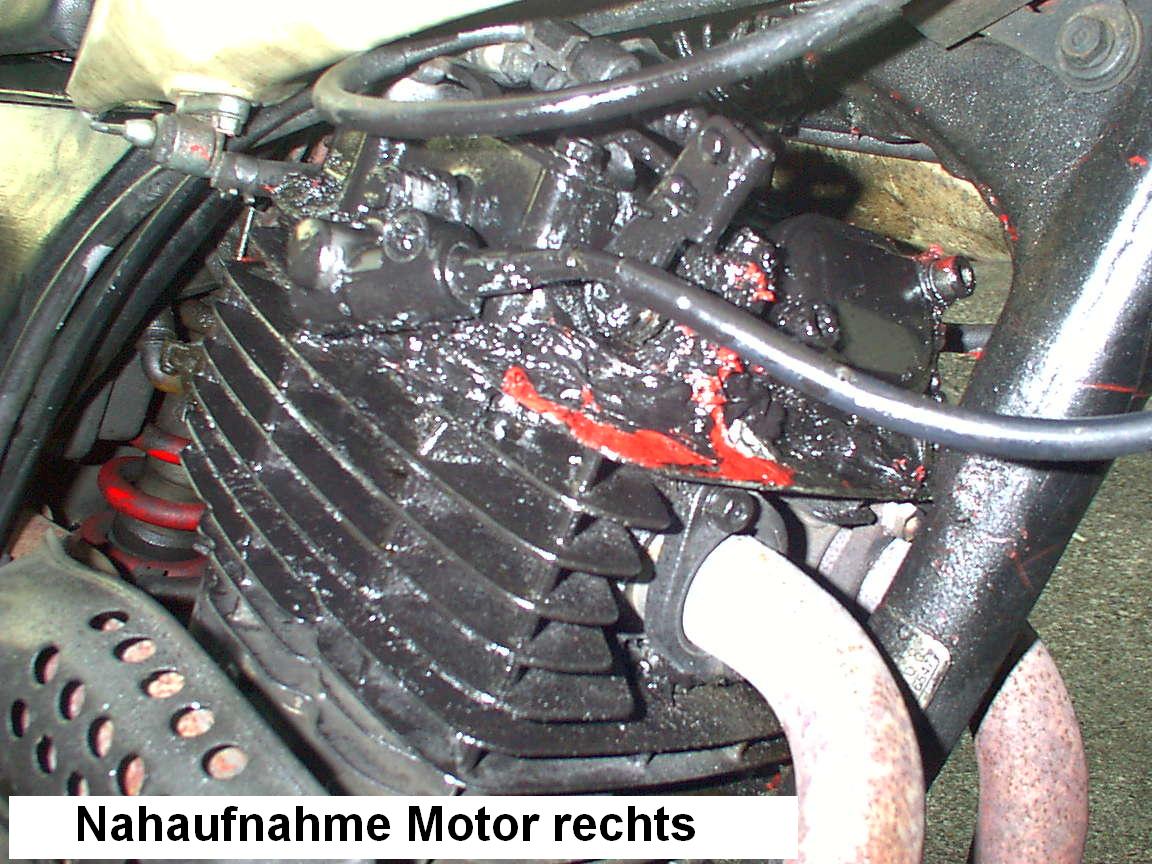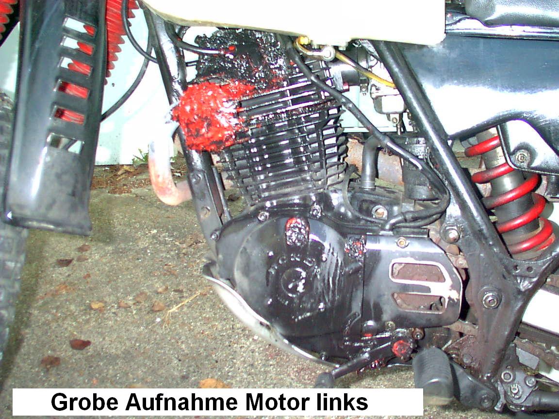 Ein Kauf bei Ebay bringt so einige kuriose Erscheinungen zu Tage. Wie Ihr auf den Fotos sehen könnt (in Natura noch einige Zacken schärfer aussieht) hat ein Laie, wenn man es noch so sagen kann, versucht ein Ölverlustproblem am Motor zu lösen. Die Lösung sah dann wohl so aus: Man nehme Dichtungsmasse, Paketband und alles was irgendwie zusammen hält (davon am besten soviel wie möglich) und klebt damit alle ersichtlichen Schrauben so wie Stellen am Motor zu, wo Öl raus kommt oder raus kommen könnte. Zum Schluss ein wenig schwarze Farbe drauf damit es nicht ganz so auffällt und fertig. Die ursprüngliche Beschreibung im Ebay dazu war folgende: