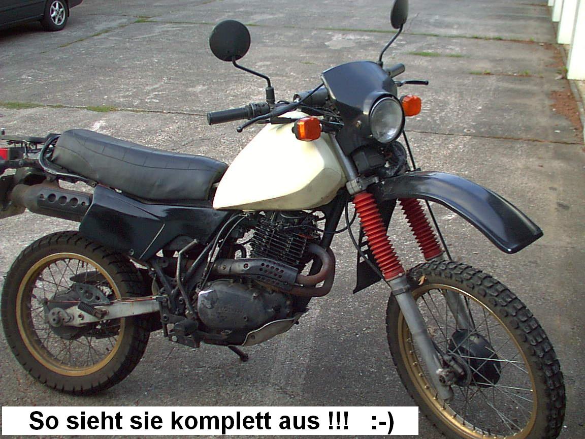 Verkaufe Honda Crossmaschine Honda XL 500 mit 27PS, TÜV 08/04, 18 Liter Tank!, Heizgriffe, Koffer, neue Batterie, neue Bremsen, neuwertiger Hinterreifen (vorne noch ok), Motor neu eingestellt. Maschine verliert Öl. Dies wurde aber mit Dichtungsmasse provisorisch behoben. Die Maschine springt problemlos an und lässt sich sehr gut fahren. Auch für Gelände geeignet! Wurde von mir nur einen Winter lang gefahren. Verkaufe es nun aber, da ich mir ein Auto zugelegt habe. Aufgrund der Mängel (ÖL und gebrauchter Zustand - siehe Foto) verkaufe ich dieses Motorrad ohne Gewährleistung und den neuen Vorschriften entsprechend als Bastlerfahrzeug.