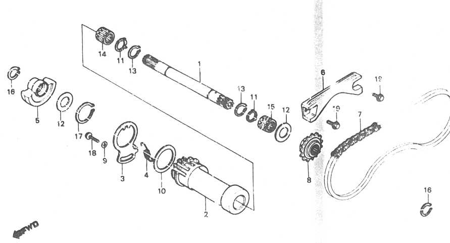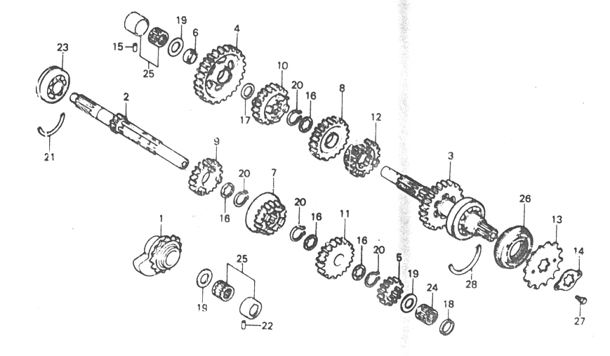 Das XL - Getriebe :Vorweg die positive Eigenschaft des XL-Motors: Da das Getriebegehäuse horizontal getrennt werden kann, ist bei Getriebearbeiten die Demontage der oberen Motorteile nicht erforderlich. Wichtig : Unbedingt die Schraube (18), Unterlegscheibe (9) und Feder (4) entfernen. Sind die Gehäusehälften erst mal getrennt hat man die freie Sicht in das Herzstück der XL. Man sollte sich erst mal in Ruhe Zahnräder , Lager, Buchsen, Schaltgabeln anschauen, ohne gleich alles auseinander zu reißen. Haben Zahnräder Erscheinungen von Pittingbildung ( die gehärtete Lauffläche zeigt Abplatzungen )?? Ist eine Pittingbildung zu erkennen, sollte das betroffene Zahnrad ausgetauscht werden. Dazu muss jetzt die entsprechende Welle aus der Motorschale gehoben werden. Besonders zu beachten ist der Aus - und Einbau der Hauptwelle ( 2 ). Wird die Hauptwelle wieder eingesetzt, so ist unbedingt die Hülse (25) für das Nadellager (25) im Sitz der Gehäusehälfte ganz nach Außen zu ziehen. Sitzt die Hülse zu dicht am Ausgleichgewicht, werden Kräfte übertragen und trotz gezogenen Kupplung krachen Schaltvorgänge herzzerreißend. Beim Zusammenbau der Gehäusehälften muss auf das Zusammenspiel der Ausgleichsgewichte geachtet werden. Dafür die Ausgleicheskette am 1, 9 und 25 Glied kennzeichnen. Von irgend einem Glied ausgehend nach rechts entlang der unteren Kettenlänge vorgehen. Das 1.te Glied auf der Markierung des vorderen Ausgleichers, das 9.te Glied auf der Markierung der Kurbelwelle ( Demontage des Schwungrades erforderlich ) und das 25.te Glied auf der Markierung des hinteren Ausgleichers ausrichten. Nach dem Einbau sollten unbedingt einmal alle Gänge durchgeschaltet werden, um den genauen Sitz der Schaltgabeln zu überprüfen. |