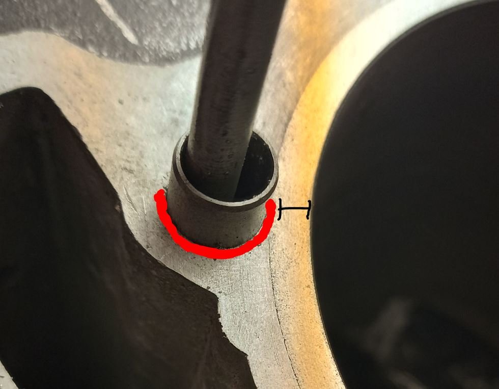 Der Schwachpunkt der Dichtung ist nicht unbedingt der Steg mit 7mm auf der Seite zum Steuerkettenschacht. Sondern die nur noch 3-4mm Distanz zu dem Loch des Stehbolzens, was ja größer als die anderen ist wegen diesem Dichtring der Ölsteigleitung. Das ist natürlich im Kopfdichtungsbereich echt nicht viel, 3-4mm!!