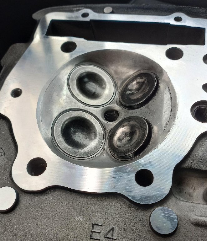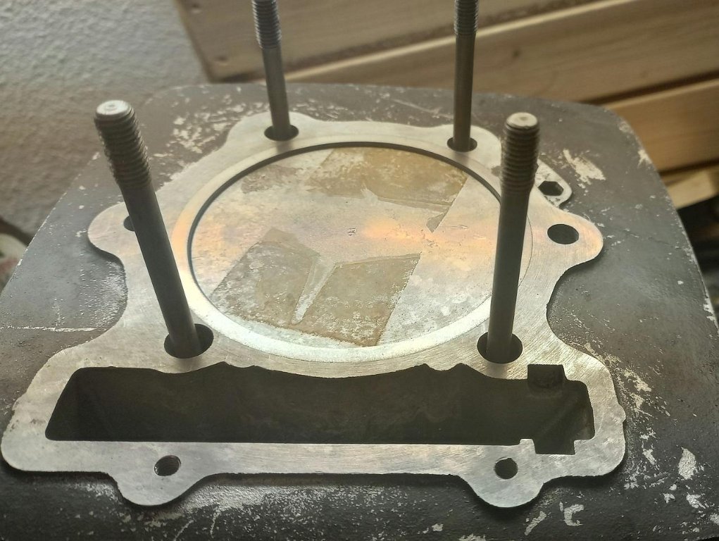 Ach ja, der Kopf kam vom Ventilsitze nachfräsen zurück und wurde geplant. Die Bearbeitung wie Vergrößern der Zylinder-Bohrung und etwas Angleichen der Quetschflächen /Polieren habe ich selbst durchgeführt. Mit Bohrmaschine und flexibler Welle geht sowas gut. Leider hat es das Getriebe der Bohrmaschine gehimmelt....(war etwas älter und kein Top-Modell).