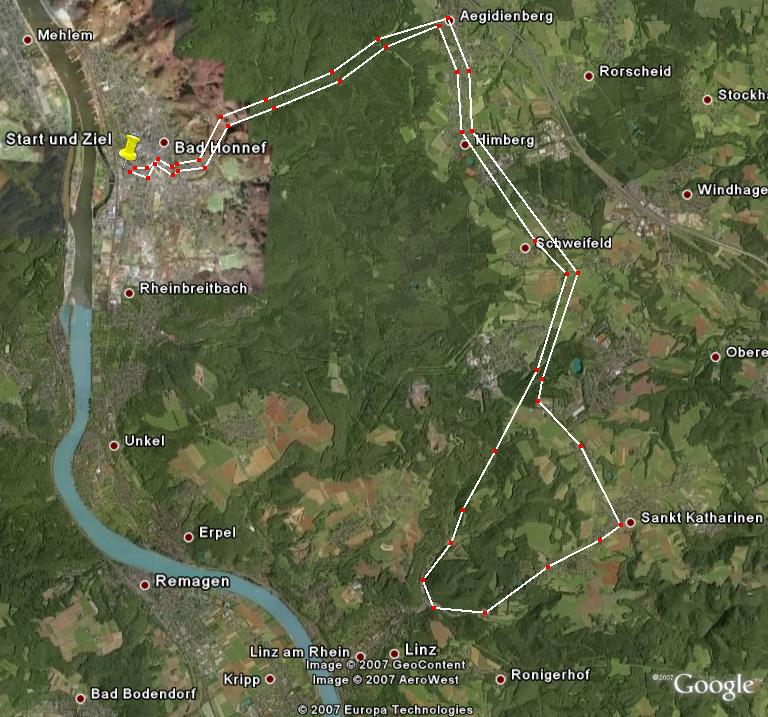 Habe das kürzlich mit einer meiner Hausstrecken gemacht. Habe sie als *.kmz gespeichert. Wenn man Google Earth installiert hat und einen Doppelklick auf die unten angefügte Datei macht, sieht man die Strecke, glaube ich.