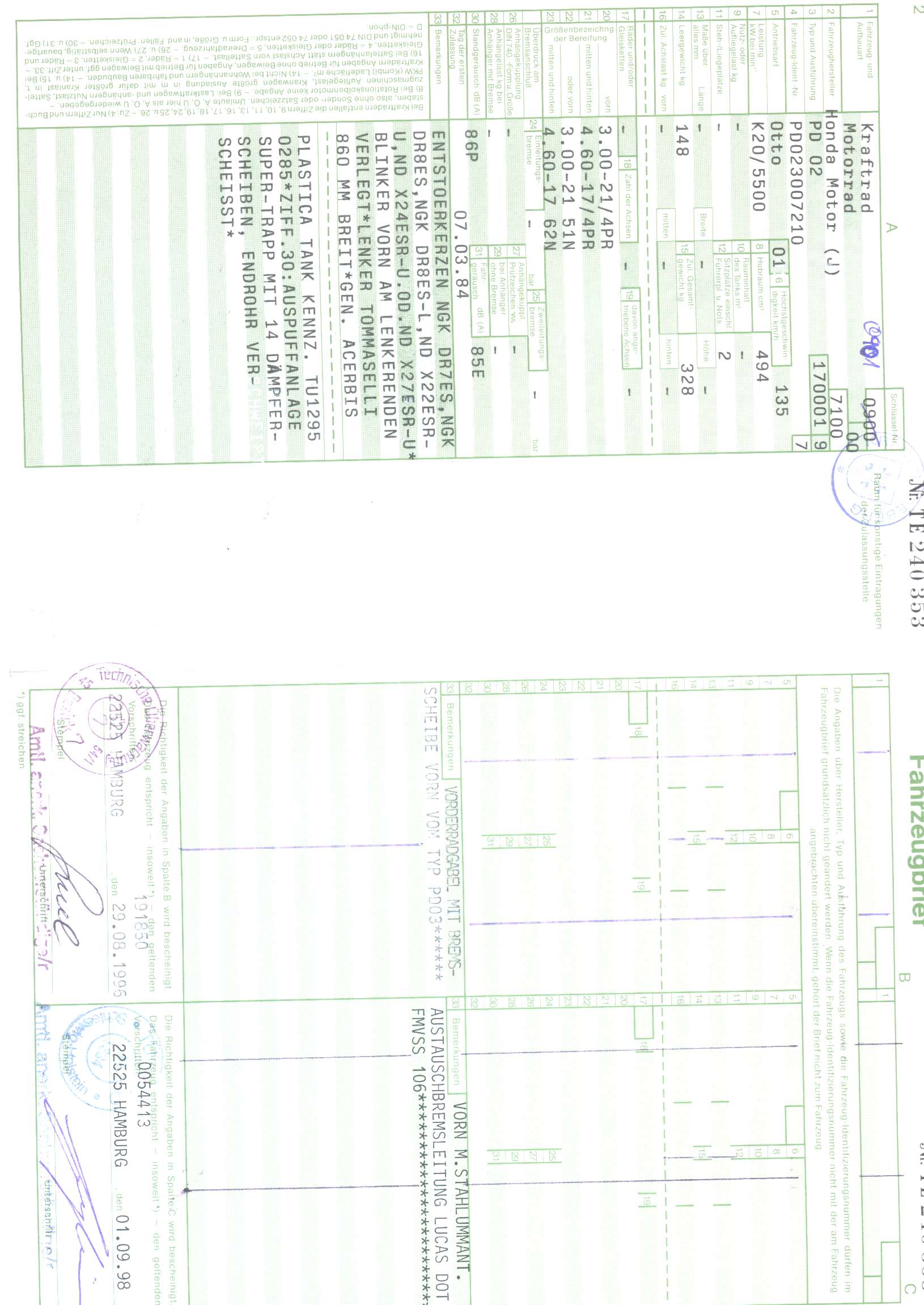 an meiner 350R war ein Tommaselli Lenker mit Kennung 0259 verbaut, der aber nicht eingetragen ist. Hat noch jemand ein Gutachten dafür rumliegen ?