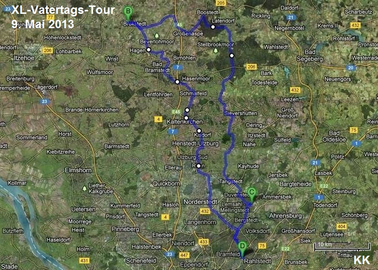 10:00 Start Farmsen/Bramfeld - Norderstedt - Kaltenkirchen - Schmalfeld (Endurotrainingsfeld?) - Brokstedt (61km)