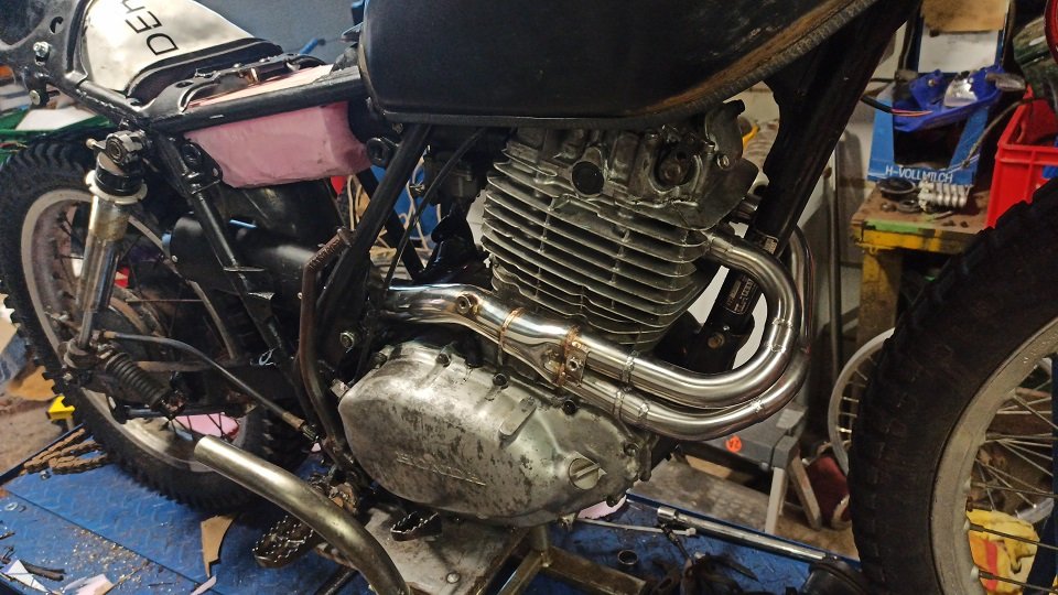 habe auch noch eine andere Sitzbank in meinem Sammelsurium gefunden welche ich vielleicht mit einem kleine unterbau auch darauf passend machen kann. Der Auspuff End Schalldämpfer wird wohl diese Position behalten. Das mit TÜV hab ich weitestgehend mal hinten angestellt seit ich en zweite hab ist die für die Straße zugelassen ich werde die hier trotzdem mal dem TÜV Prüfer vorführen und mal schauen was der dazu sagt. der krümmer ist von na xr400 den hat mir eine freund um geschweißt das er passt.