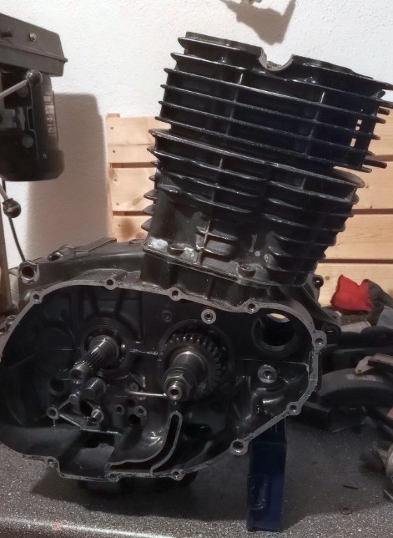 So, die erste "Anprobe" ist erfolgreich, Zylinder passt aufs Gehäuse und auch der Kolben braucht am unteren Totpunkt keinen zusätzlichen Platz. Das war eigentliche Grund für den Test. Je nach Kolbenform muss man evtl. im Gehäuse seitlich an der Verdickung des Stehbolzengewindes noch Material wegnehmen... Ist aber bei mir nicht notwendig.